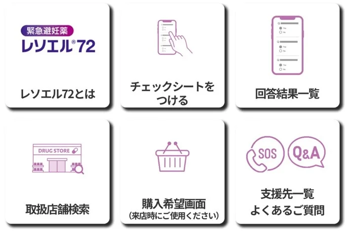 またレソエル72は公式LINEも公開し、店舗検索のほか、来店前に準備ができる「チェックシート機能」*、緊急避妊薬は服用後に妊娠検査薬などで妊娠の有無を確認する必要があるため、服用から3週間後に自動メッセージで確認を促す「フォローアップ機能」を提供しています。