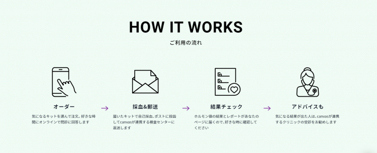 届いたキットで自己採血、ポストに投函してcanvasが連携する検査センターに返送。