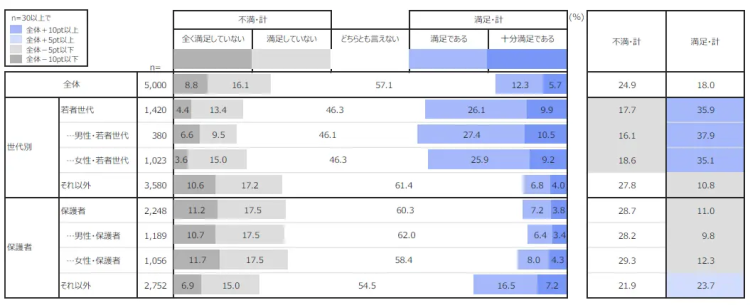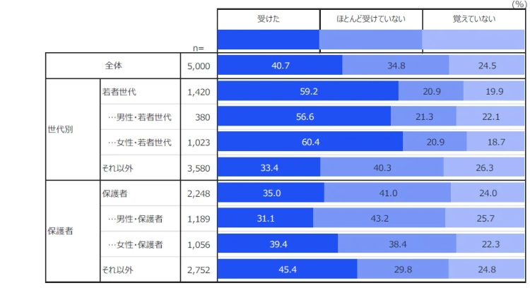 学校で性教育を受けた経験があると答えたのは全体の40.7%。若者世代(15〜24歳)では59.2%と半数を超えるが、内容への満足度は全体でわずか18.0%にとどまった。若者世代でも35.9%と、3人に2人は満足していないという結果に。