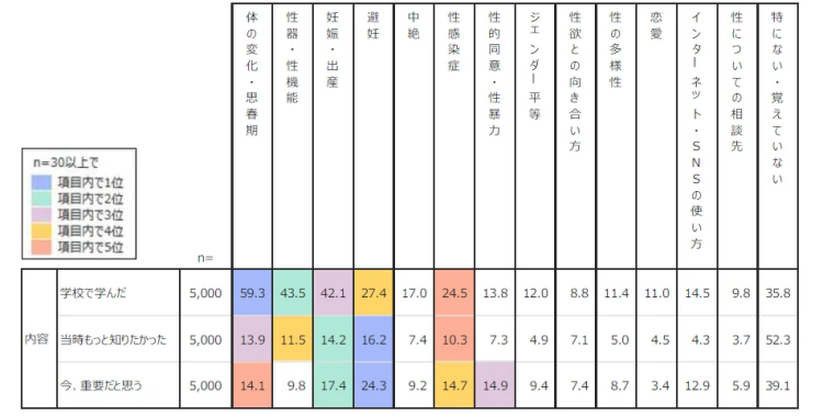 学んだ内容で最も多いのは「体の変化・思春期」(59.3%)。一方で、当時もっと知りたかった内容としては「避妊」(16.2%)や「妊娠・出産」(14.2%)があげられました。
