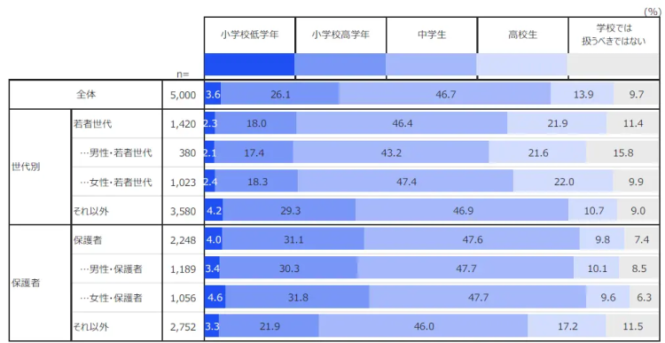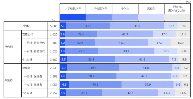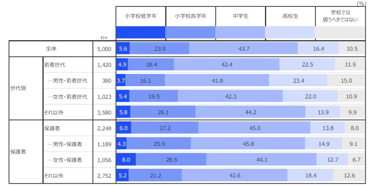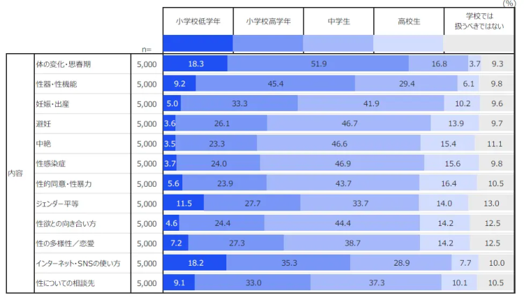 また、性教育を始める時期についても、多くの人が早い段階での実施が望ましいと考えていることが分かりました。
