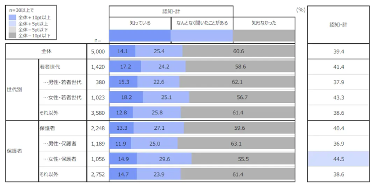 一方で、過半数はまだ認知していない状況であり、社会全体への周知が十分とは言えない可能性も見えてきました。若者世代の女性でも「知っている」「聞いたことがある」を合わせた認知率は43.3%にとどまっています。