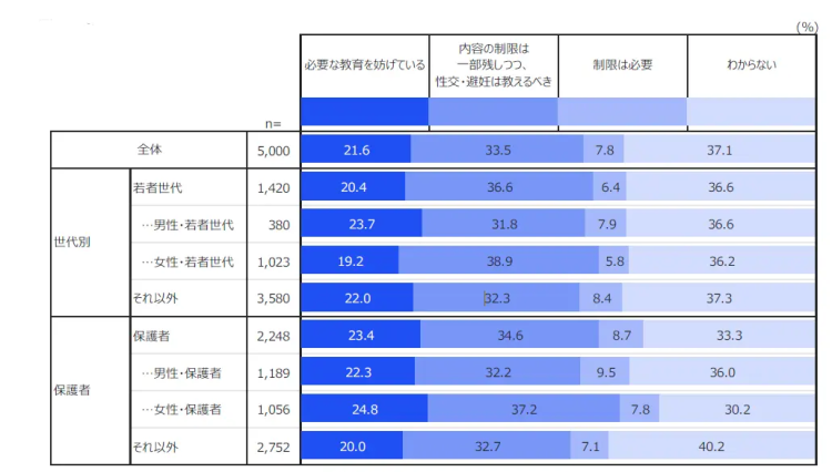 一方で、この規定についての考え方を尋ねると、「必要な教育を妨げていると思う」(21.6%)、「制限は一部残しつつも、性交や避妊については教えるべき」(33.5%)といった回答が見られ、合わせると半数以上が、より踏み込んだ性教育を求めていることが分かりました。