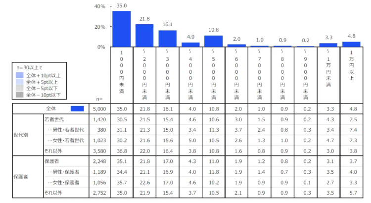 一方、調査では希望する価格として「1,000円未満」(35.0%)が最も多く、「3,000円未満」までを含めると全体の7割以上(72.9%)に達しました。実際の販売価格との差が明らかになっています。
