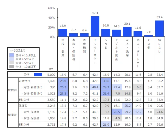性に関する情報源として最も多かったのは「インターネット」(42.4%)でした。次いで「特になし」(33.4%)、「学校・教員」(15.9%)と続いています。