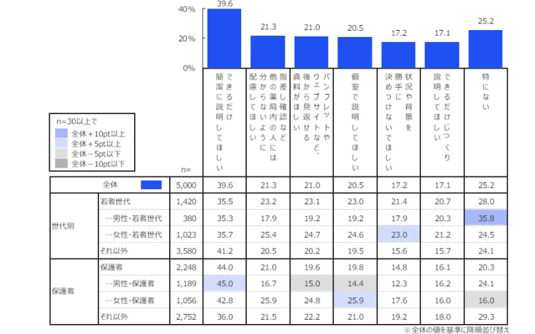 薬剤師に求める対応については、「簡潔な説明」(39.6%)を望む声が多く、必要な情報をわかりやすく得られる環境が求められているようです。