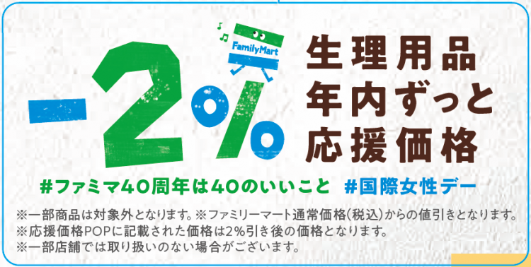 株式会社ファミリーマートが、創立40周年を記念した「40のいいこと!?」の取り組みの1つとして、生理用品25種類を、3月8日の「国際女性デー」の翌日から通常価格より2%引きで展開する。(※沖縄県を除く)