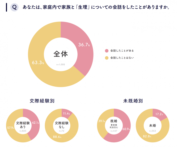 家庭内で生理について会話をしたことがある男性は全体の36.7%という結果に。交際経験のある男性では6割弱、妻がいる人でも4割近くが家庭内で生理について会話したことがないという結果になり、家庭内でも生理について会話するのは難しいと感じている男性が多いようだ。