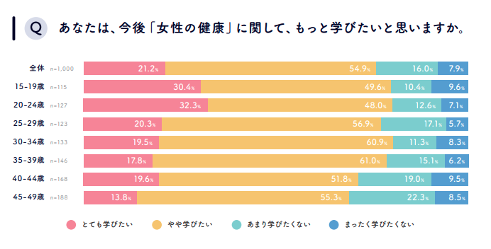 また、男性に自分自身の課題として女性の健康を学びたいと思っているかを尋ねた項目では、「やや学びたい」が54.9%と最も多く、「とても学びたい」が21.2%という結果に。積極的はあまりないものの、学ぶ意欲のある男性は半数を占めているようだ。年代別で見た結果はこれまでと同じく、24歳以下の若い世代ほど「とても学びたい」の割合が高くなっている。