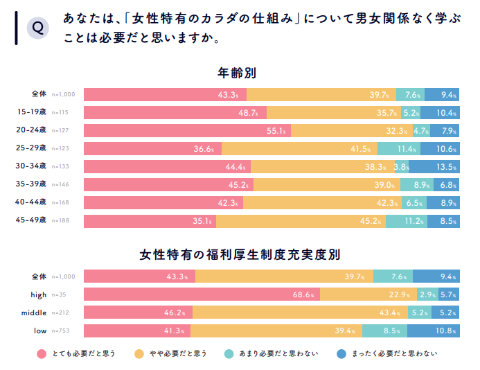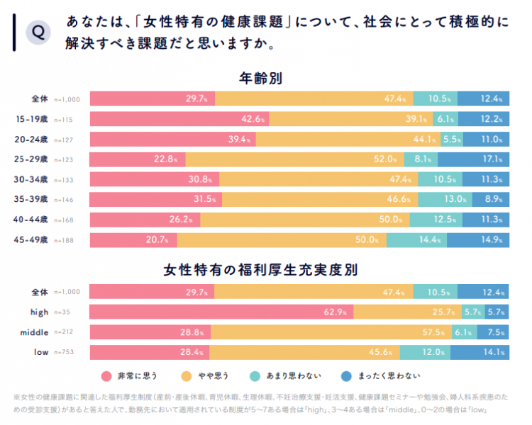 ただ、年代別では30〜34歳、女性特有の福利厚生制度充実度別では勤務先で適用されている女性の健康課題に関連した福利厚生制度が0〜2個の「low」層では「全く必要だと思わない」の回答がそれぞれ13.5%、10.8%とやや高めになっていることには留意したい。