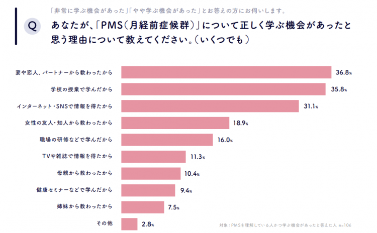 PMSについて理解していると答えた男性でも、半数以上は、「あまり/まったく学ぶ機会がなかった」と回答し、生理に対して同様の質問をしたときとほとんど同じ結果となった。