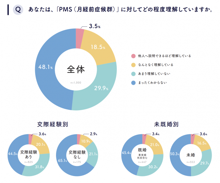 生理について説明できると回答した男性が半数いたのに対して、PMSについては「他人へ説明できるほど理解している」と「なんとなく理解している」をあわせても全体の約2割にとどまる結果に。8割近くの男性がPMSについて理解していないことがわかった。