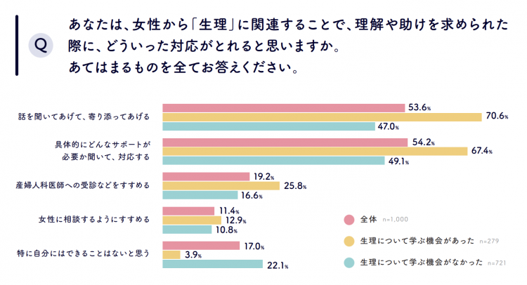 また、女性から生理に関連することで理解や助けを求められた際にどのような対応がとれるかという質問では「特に自分にできることはないと思う」(17.0%)と答えた人のうち、学ぶ機会がなかった人は22.1%、学ぶ機会があった人は3.9%と比べて大幅に多い結果に。生理について学ぶ機会の有無が、サポートへの積極的な姿勢に関係していることがわかった。