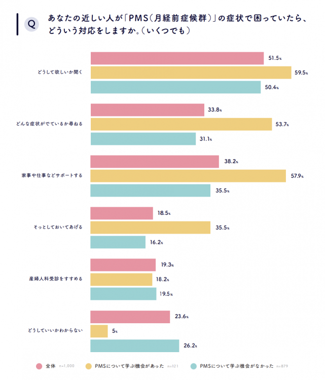 PMSの症状で女性が困っていた場合の対応として、最も多かったのは「どうして欲しいか聞く」、続いて「家事や仕事のサポート」「症状を尋ねる」の項目。PMSについて学ぶ機会がなかった男性は「どうしていいかわからない」の割合が26.2%で、学ぶ機会があった男性の5%と比べて圧倒的に多い結果となった。