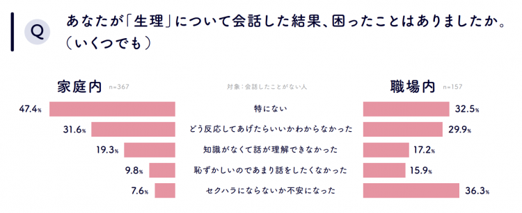 生理について会話したことで困ったことがあるかどうかを聞いた質問では、家庭内と職場内で大きく結果が分かれた。家庭内では「特にない」が47.4%で半数を占めたのに対して、職場内では「セクハラにならないか不安になった」が36.6%と最も多い結果になった。