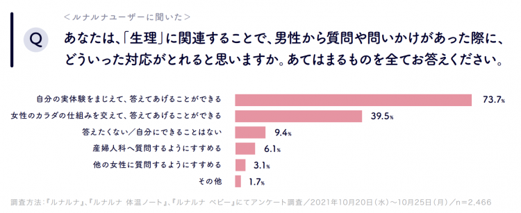 生理に関して男性から質問や問いかけがあった際に、どういった対応がとれるかを女性に尋ねた結果、最も多かった回答は「自分の実体験をまじえて答えてあげることができる」(73.7%)で、7割以上の女性が回答。次に多かったのが「女性のカラダの仕組みをまじえて答えてあげることができる」(39.5)だった。