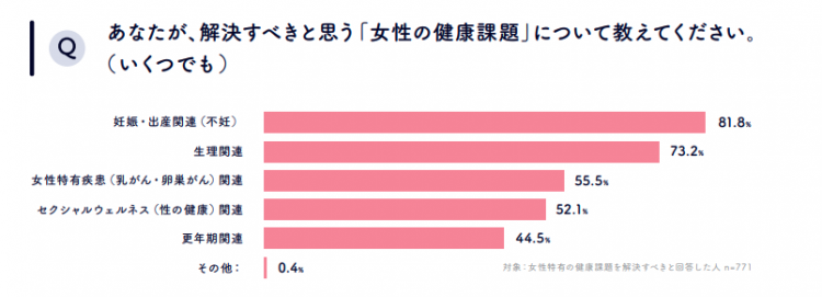 解決すべきだと考えている女性の健康課題としては「妊娠・出産関連(不妊)」が81.8%、「生理関連」が73.2%で最も多くあがった。次いで「女性特有疾患(乳がん・卵巣がん)関連」が55.5%、「セクシャルウェルネス(性の健康)関連」が52.1%、「更年期関連」が44.5%で、女性にとっては大きな課題でも、出産などと比べると男性からの理解は低いことがわかった。
