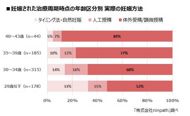 女性側の年齢で算出した年齢区分別にみると、年齢が上がるほどタイミング法・自然妊娠の割合が下がり、人工授精や体外受精/顕微授精などの高度不妊治療での妊娠の割合が高まる傾向が明確となった。
