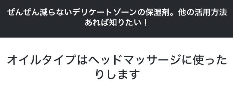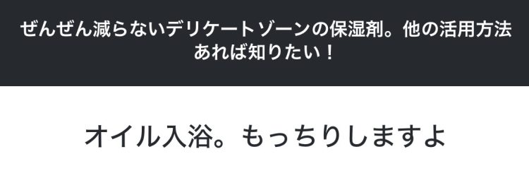 オイル入浴!?調べてみたら、デリケートゾーンオイルをぬってそのまま入浴するのだそう。そのまま洗い流さずとも、汚れが浮き上がってくるのだとか。お風呂上がりにさらに保湿しなくていいのでよいかも?