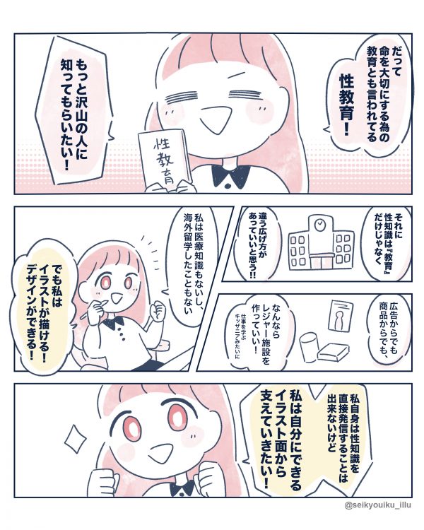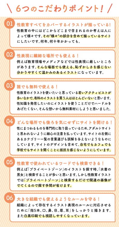 「性教育いらすと」は、性教育にまつわる活動をしている65人に実施したアンケートで、「正確なイラストがない」「微妙なニュアンスを表現できるイラストがない」「マニアックなイラストがない」などイラストに対する悩みが寄せられたことから誕生した。