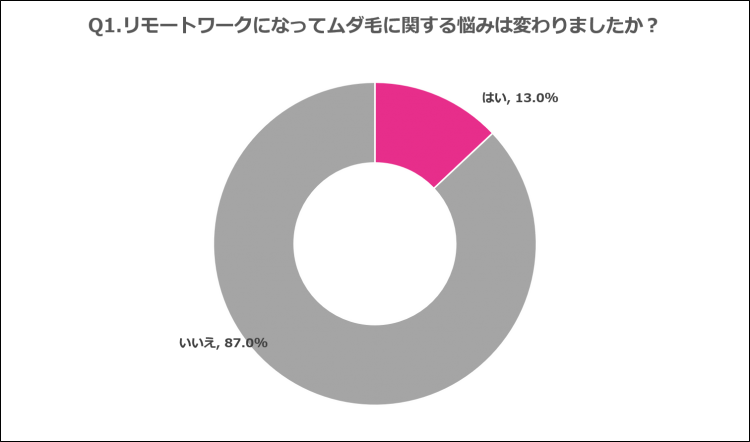 「リモートワークになってムダ毛に関する悩みは変わりましたか」に対する回答は「はい」が13.0%、「いいえ」が87.0%という結果で、意外に毛に関する悩みは変化していないようだ。一方で、変化した人の存在も一定数がしっかりと確認できる結果に。