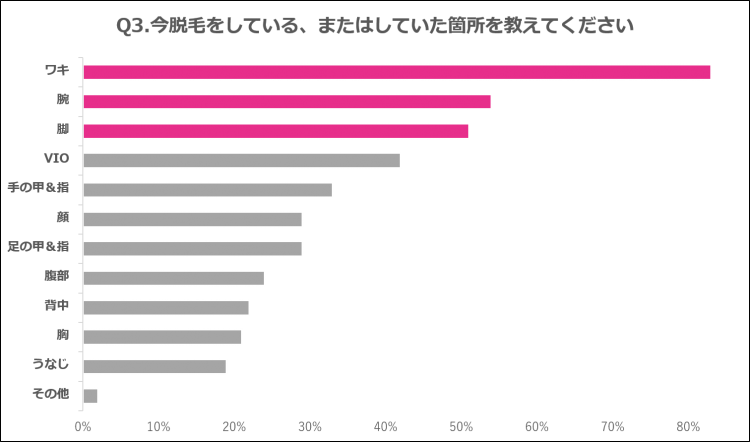 「今脱毛をしている、またはしていた箇所を教えてください(複数回答)」という質問では、「ワキ」が83.0%、「腕」が54.0%、「脚」が51.0%、「VIO」が42.0%、「手の甲&指」が33.0%、「足の甲&指」が29.0%、「顔」が29.0%、「腹部」が24.0%、「背中」が22.0%、「胸」が21.0%、「うなじ」が19.0%、「その他」が2.0%という結果に。