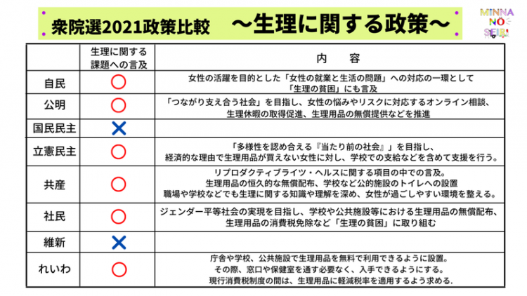 (本記事は、2021年10月18日note掲載「2021年衆議院選挙〜生理に関する政策〜」を編集し転載したものです)