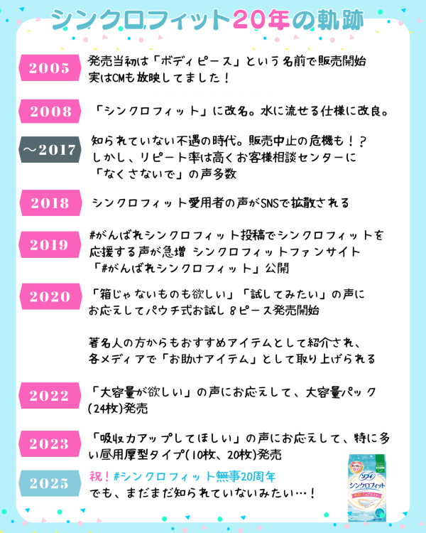 20周年を迎えたシンクロフィットですが、まだまだ認知率も低く、生理の漏れに悩んでいる方にお届けできていない状況とのこと。