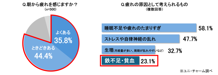しかし、疲れの原因として鉄不足を挙げた女性は約2割にとどまり、原因が分からず対処していない女性が約65%に上ることも明らかになりました。