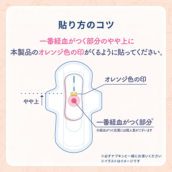 使用時に気をつけてもらいたいのは、このシートはナプキンではないため防水機能はなく、経血自体はシートを通過して下のナプキンに移行します。必ずナプキンの上にセットするようにしましょう。