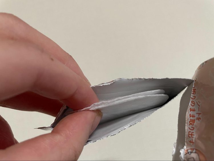 パッケージを開けると、シートが内側に折りたたまれており、指で挟むようにして取り出します。取り出すと粘着面が自然に露出する仕組みです。