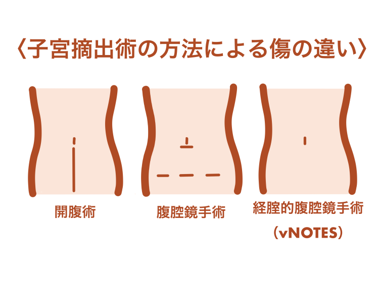 vNOTESのメリットはお腹に傷がつかないことです。膣から器具を挿入するため膣壁には小さな穴を開けますが、外見上の傷は残りません。vNOTESの入院期間は、腹腔鏡手術と同様に術後3〜5日程度です。